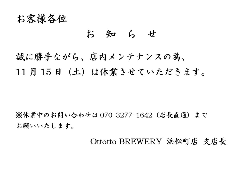 【浜松町店】臨時休業のお知らせ